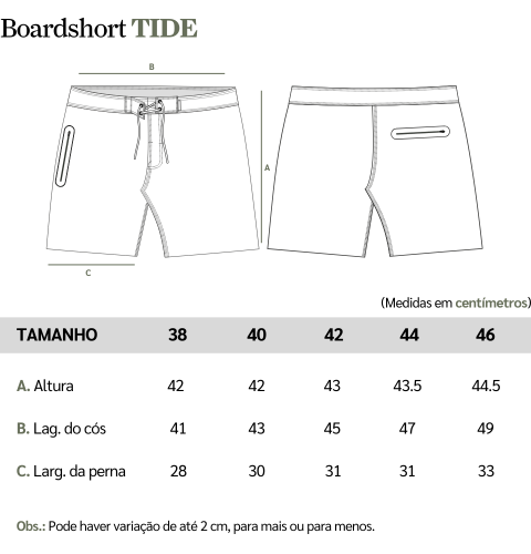 Observação: Confira com atenção as medidas do nosso Boardshort WKND. Se você já conhece nossas peças, no caso desse Boardshort recomendamos escolher um tamanho maior do que o seu tamanho usual.